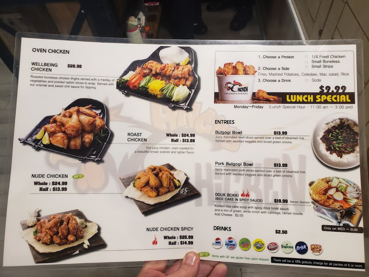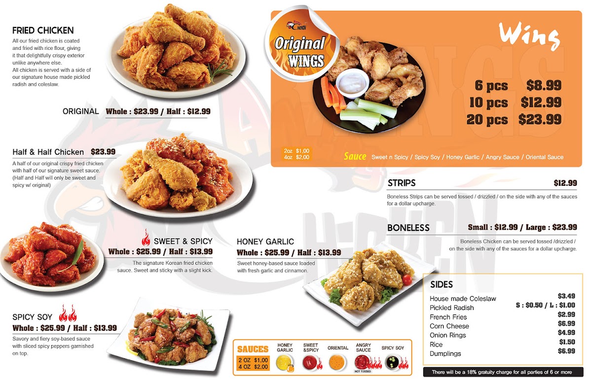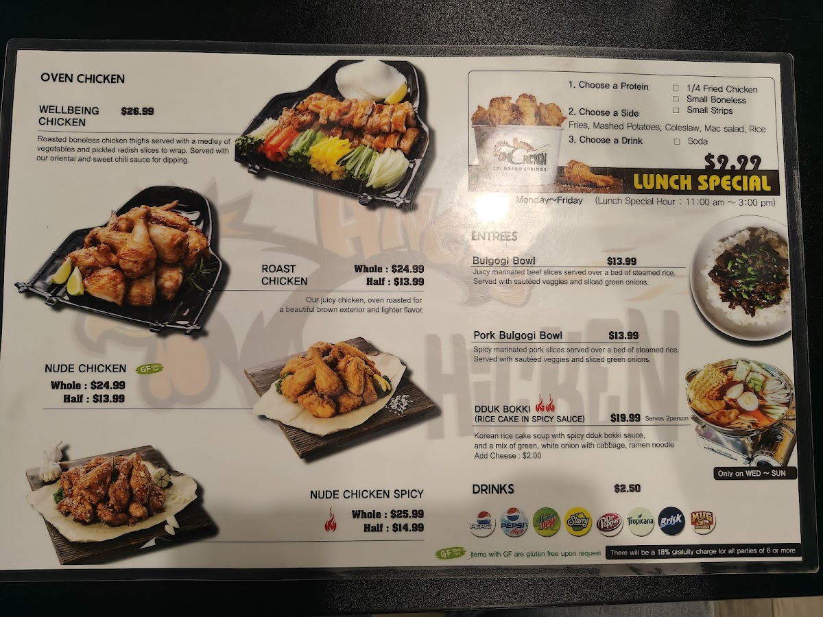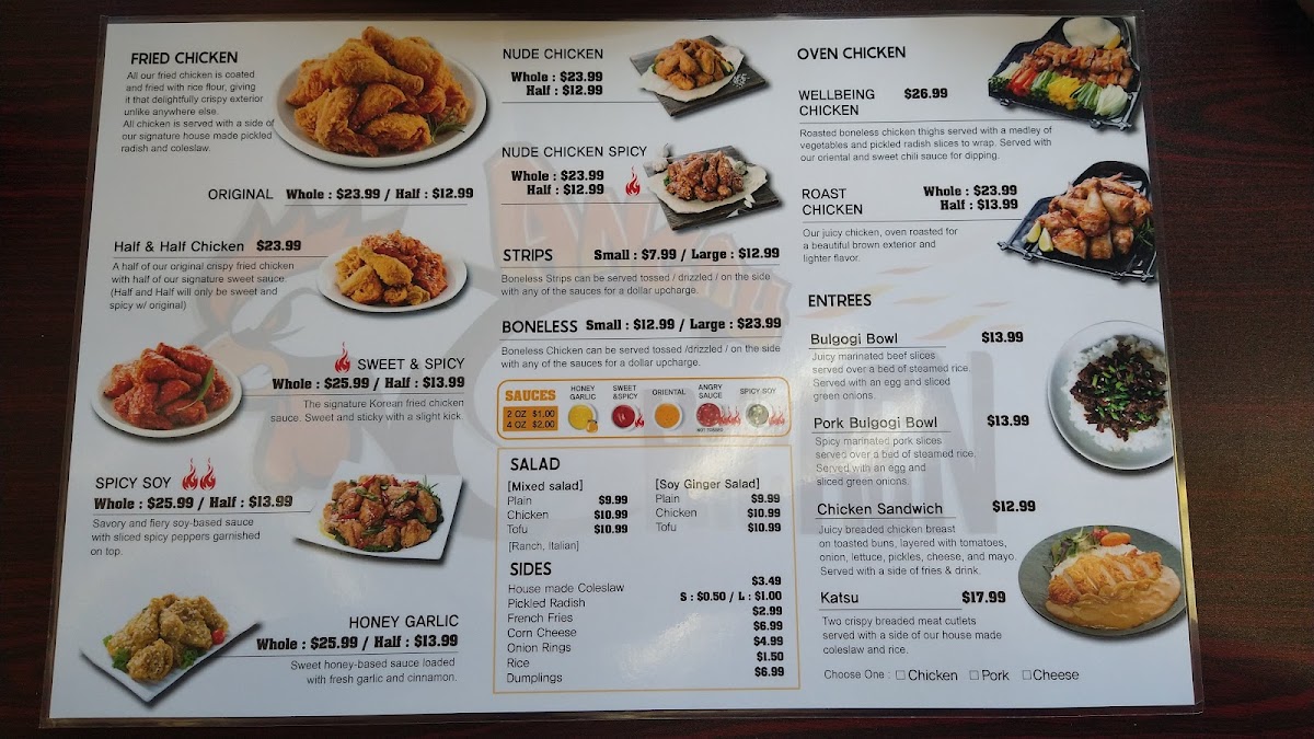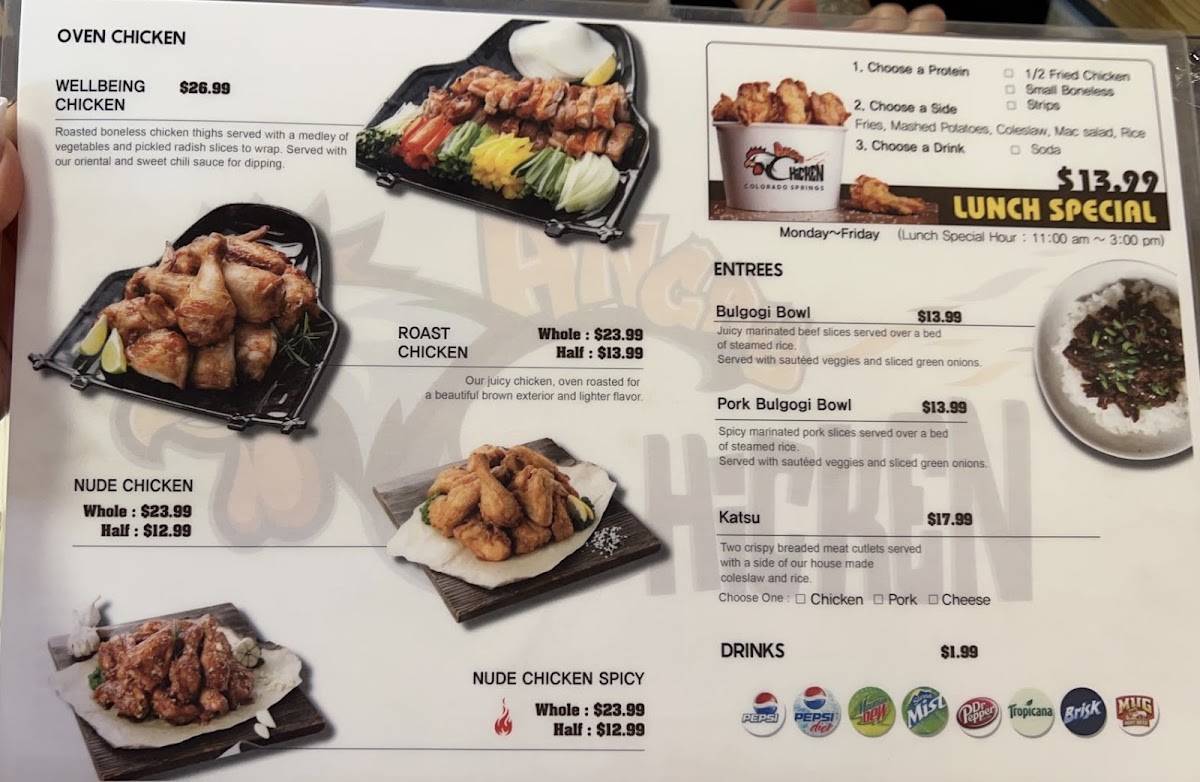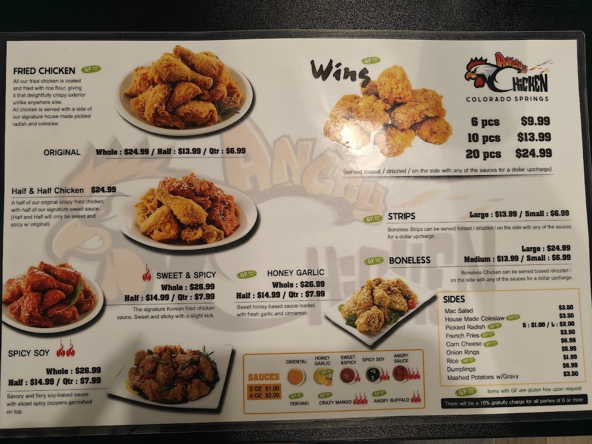 Introducing the mouthwatering offerings of Angry Chicken and Juicy 88 Hotdog, located in Colorado Springs. This culinary gem specializes in Korean fried chicken that perfectly balances flavor and texture. Highlights include their Half & Half Chicken, crisp on the outside with a sweet and spicy twist, priced at $23.99. For those craving something different, the Sweet & Spicy and Spicy Soy options deliver irresistible heat and savory goodness.